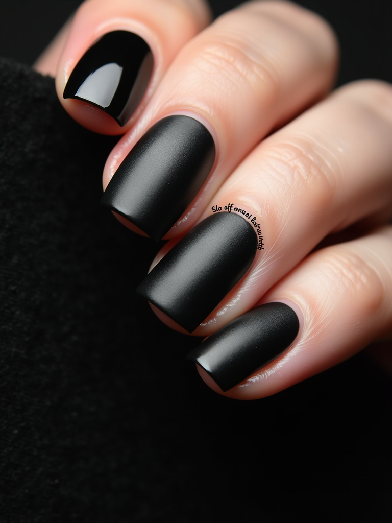 black matte nails with glossy tips, dramatic close-up with contrast lighting, edgy modern styling, professional manicure display