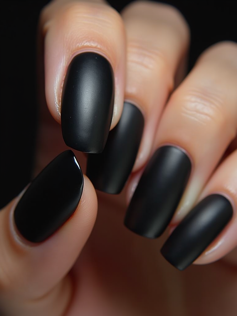 black matte nails with glossy tips, dramatic close-up with contrast lighting, edgy modern styling, professional manicure display