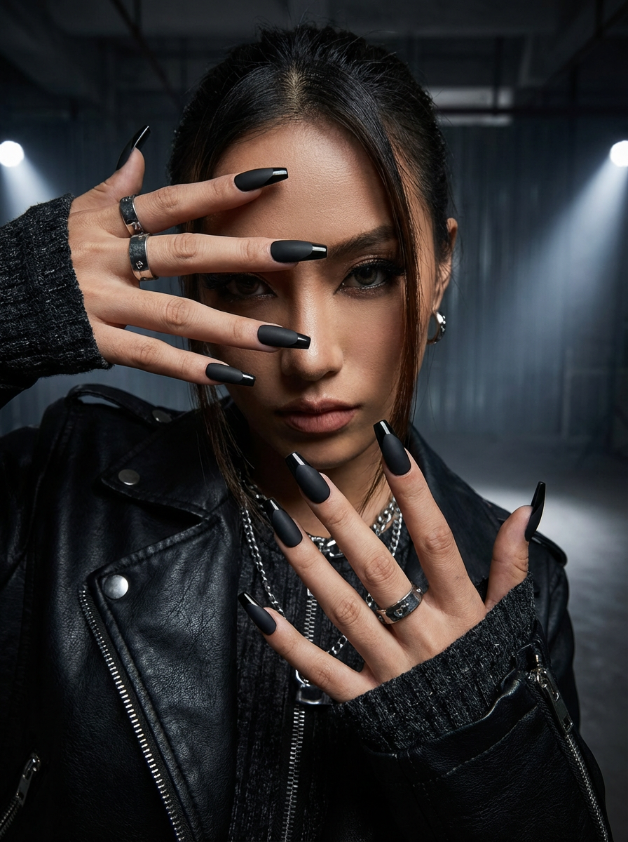 black matte nails with glossy tips, dramatic close-up with contrast lighting, edgy modern styling, professional manicure display
