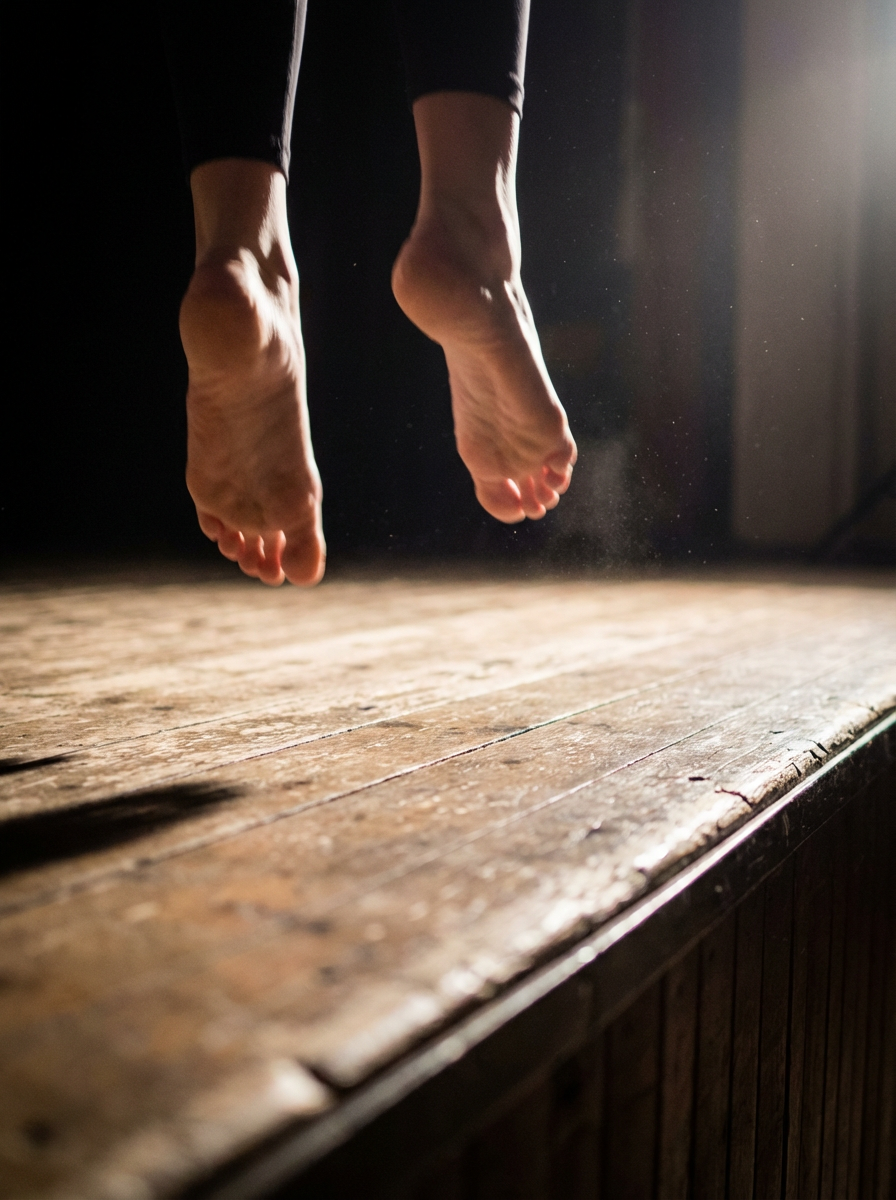 bottom of Model's bare feet, captured mid-dance on a wooden stage, with dramatic lighting highlighting the movement, also showing the bottom of feet.
