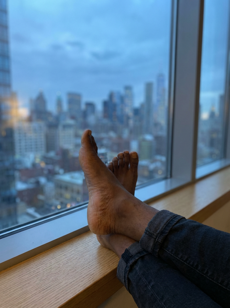 bottom of Model's bare feet, elegantly crossed, with a cityscape visible through a large window in the background, also showing the bottom of feet.