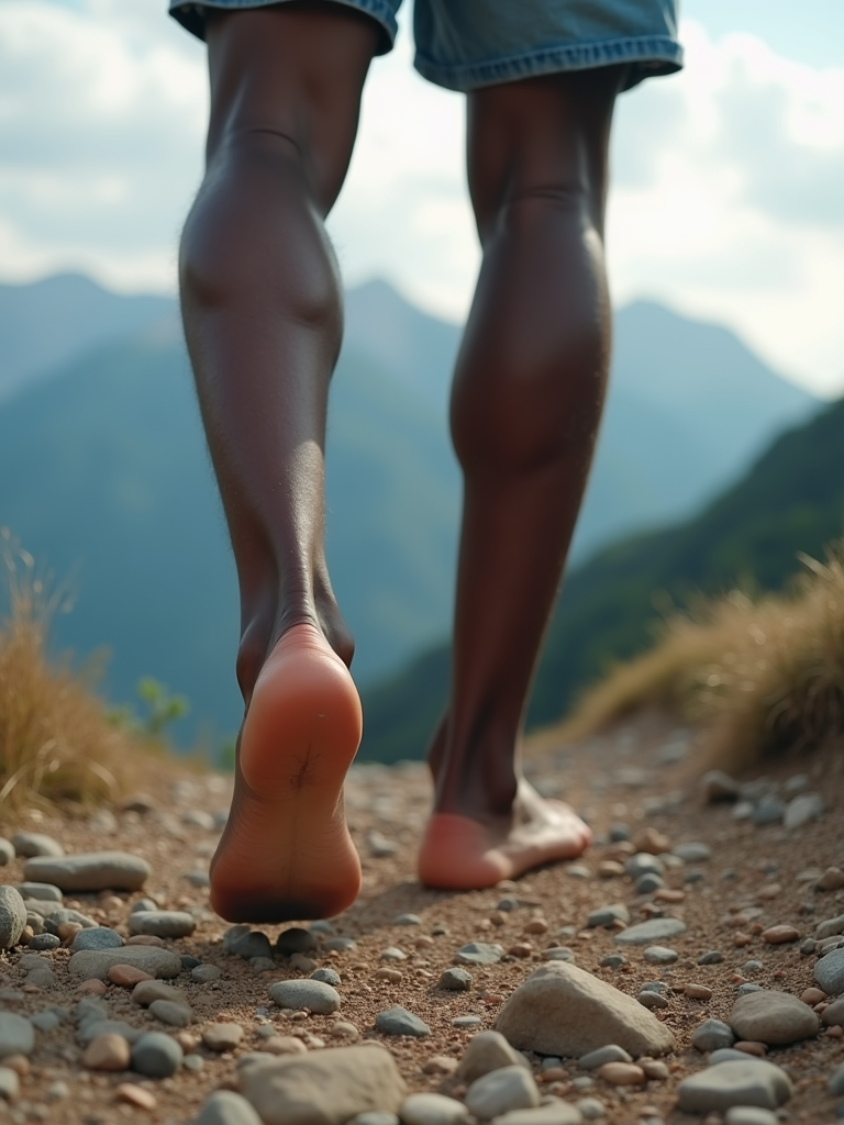 bottom of Model's bare feet, standing on a rocky trail with a breathtaking mountain view in the background, also showing the bottom of feet.