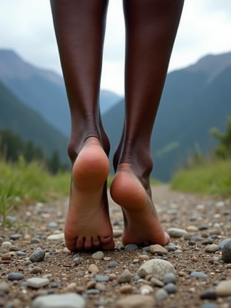 bottom of Model's bare feet, standing on a rocky trail with a breathtaking mountain view in the background, also showing the bottom of feet.