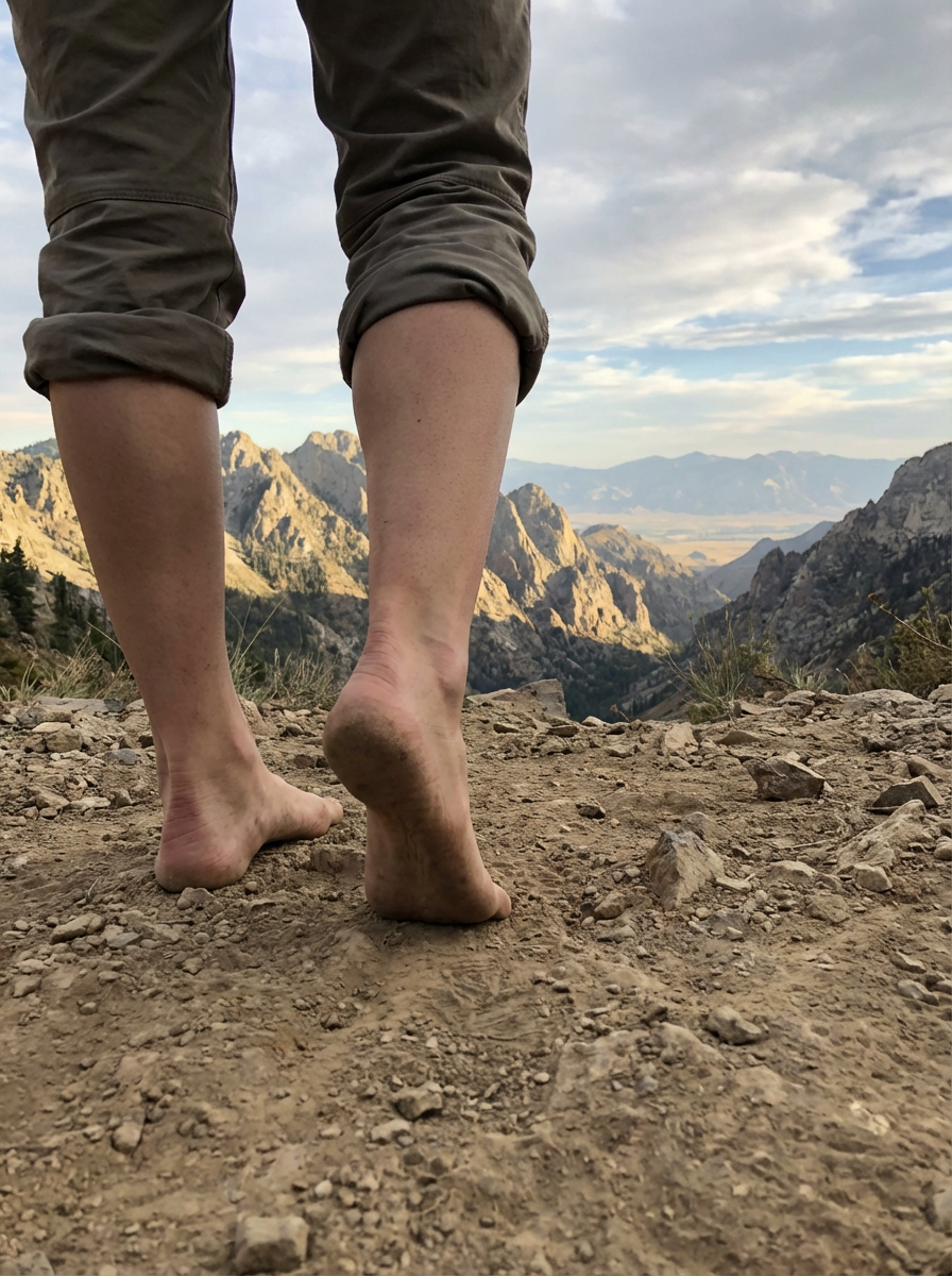 bottom of Model's bare feet, standing on a rocky trail with a breathtaking mountain view in the background, also showing the bottom of feet.