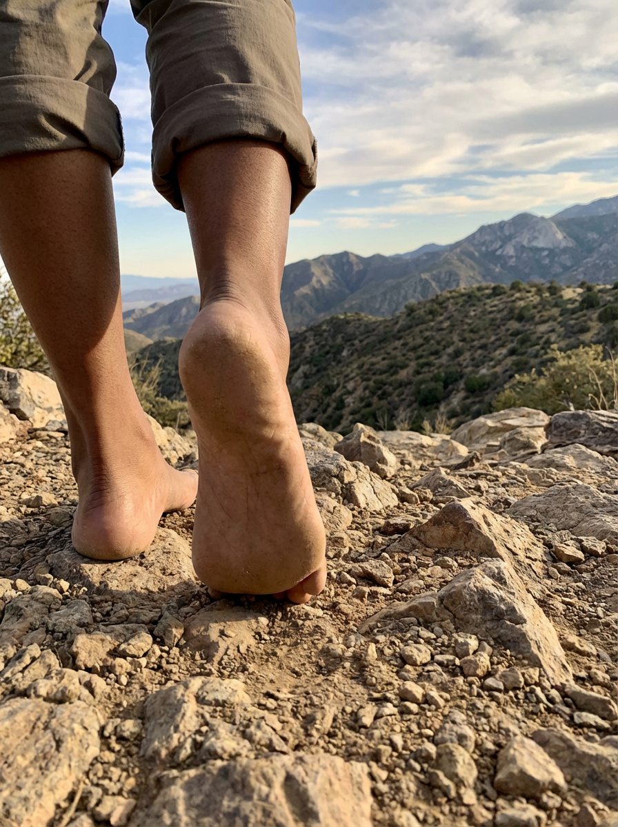 bottom of Model's bare feet, standing on a rocky trail with a breathtaking mountain view in the background, also showing the bottom of feet.