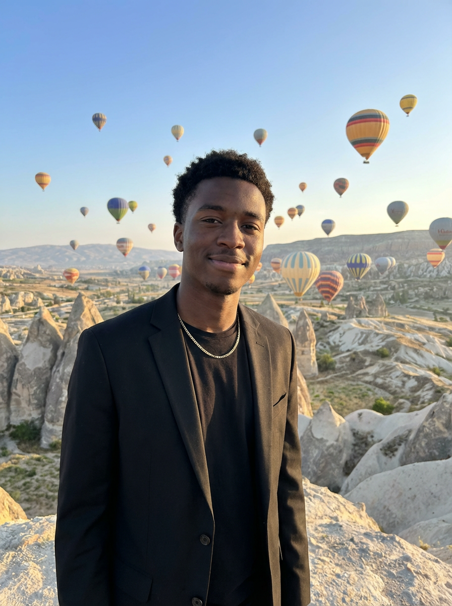 Breathtakingly model with hot air balloons in the background in cappadocia, Türkiye. Cappadocia, Turkey