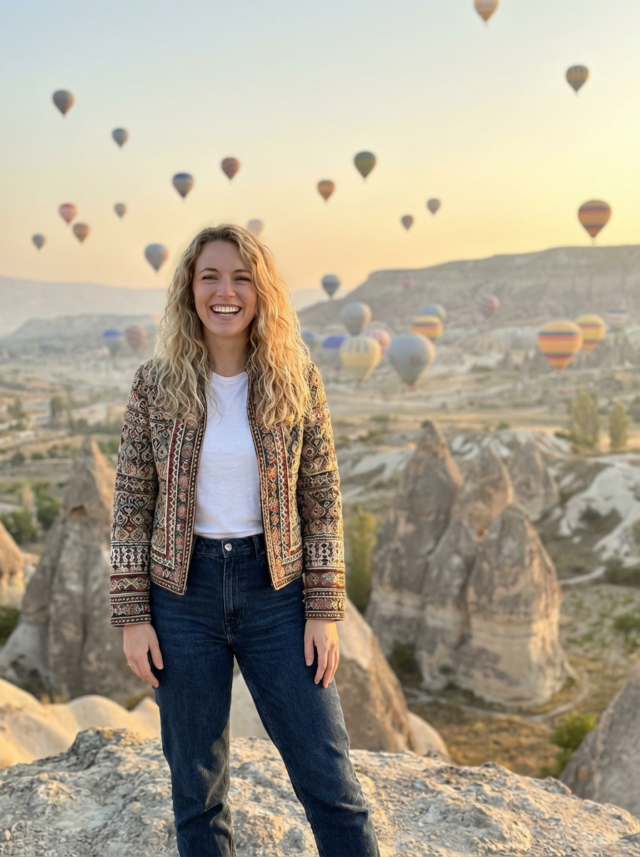 Breathtakingly model with hot air balloons in the background in cappadocia, Türkiye. Cappadocia, Turkey