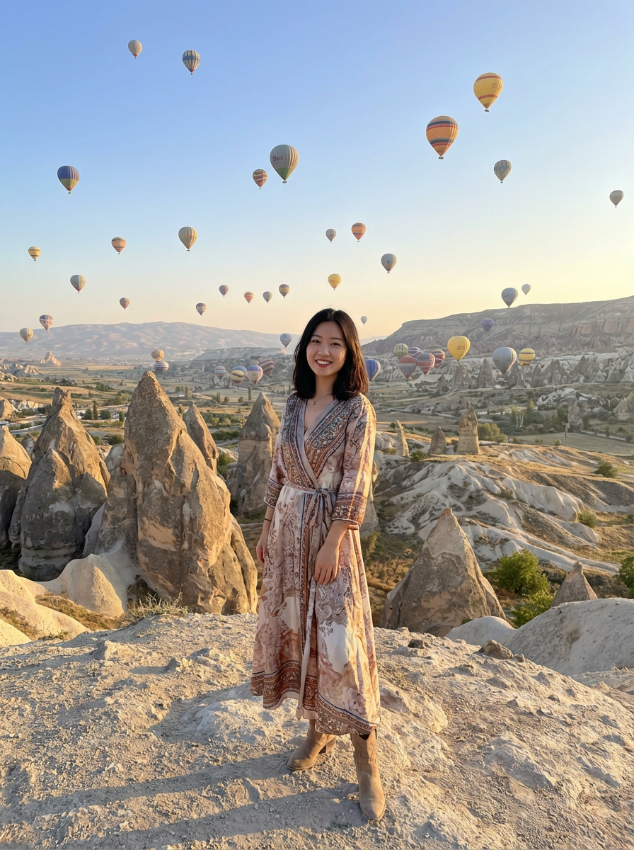 Breathtakingly model with hot air balloons in the background in cappadocia, Türkiye. Cappadocia, Turkey