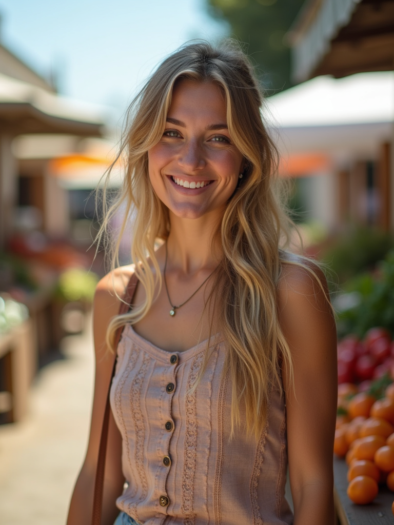 bright-spirited feminine model exploring a local farmers' market in daylight