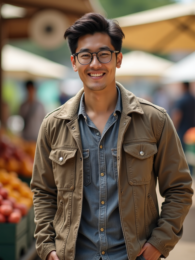 bright-spirited masculine model exploring a local farmers' market in daylight