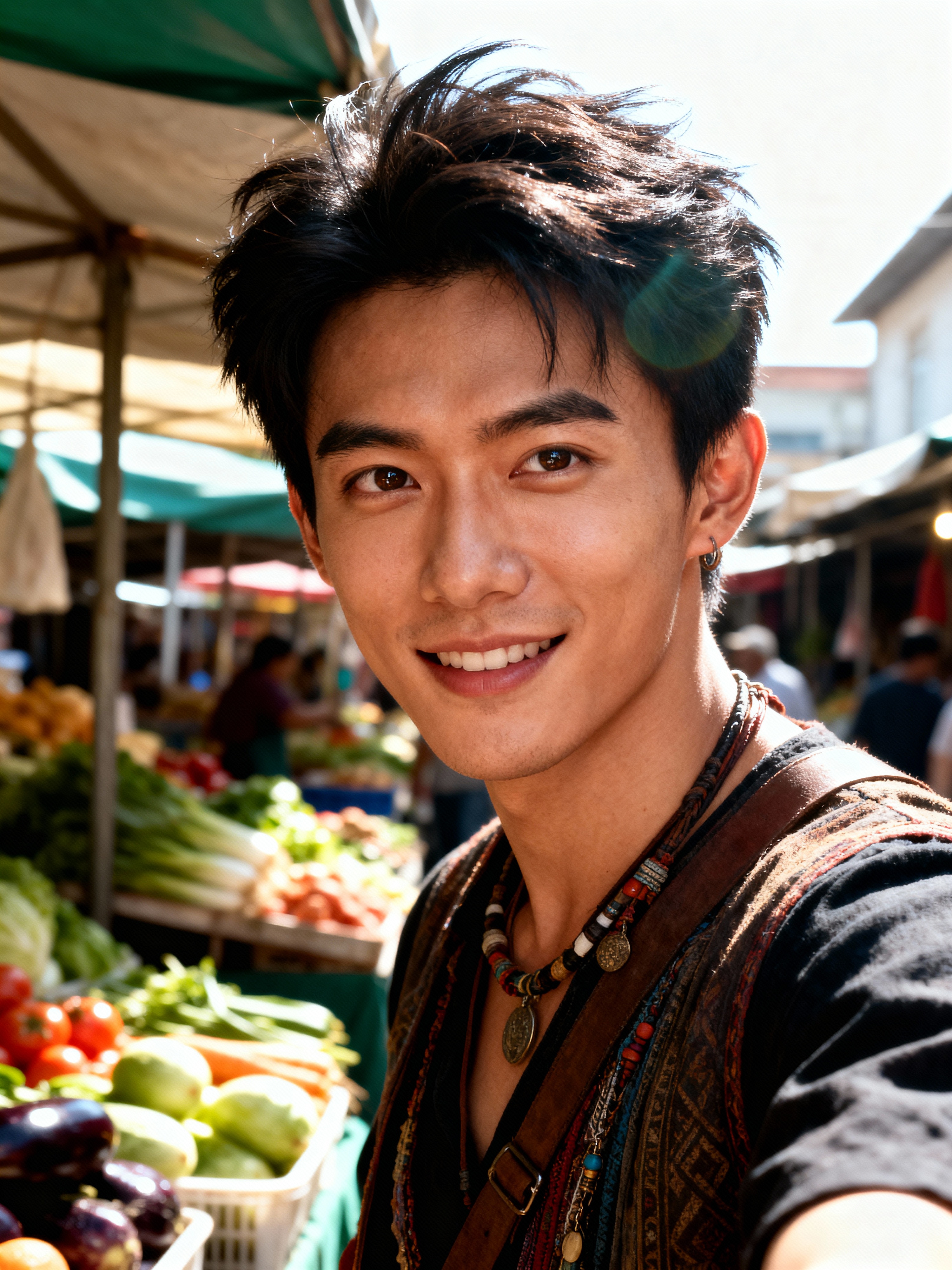 bright-spirited masculine model exploring a local farmers' market in daylight