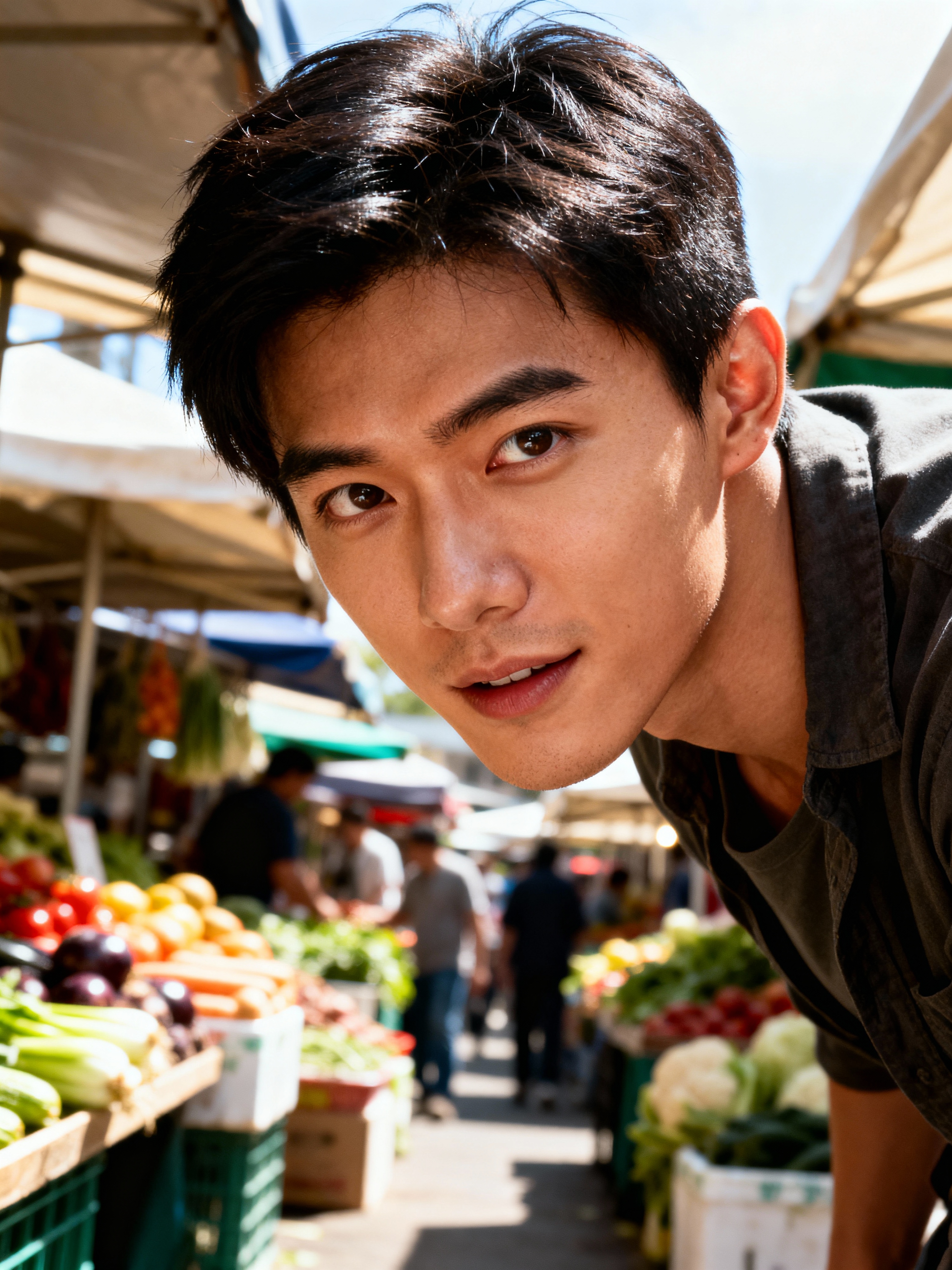 bright-spirited masculine model exploring a local farmers' market in daylight