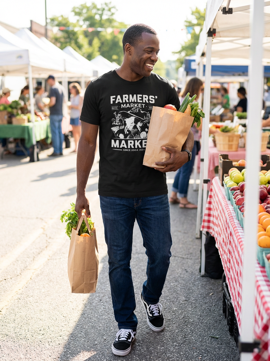 bright-spirited masculine model exploring a local farmers' market in daylight