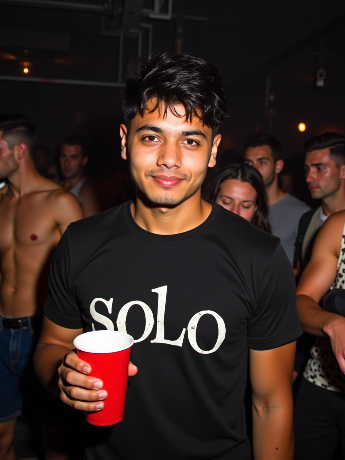 camera flash overexposed, model at a crowded house party, red solo cup in hand. Wearing a graphic tee, casual pose. Flash-lit faces, messy background, candid vibe.