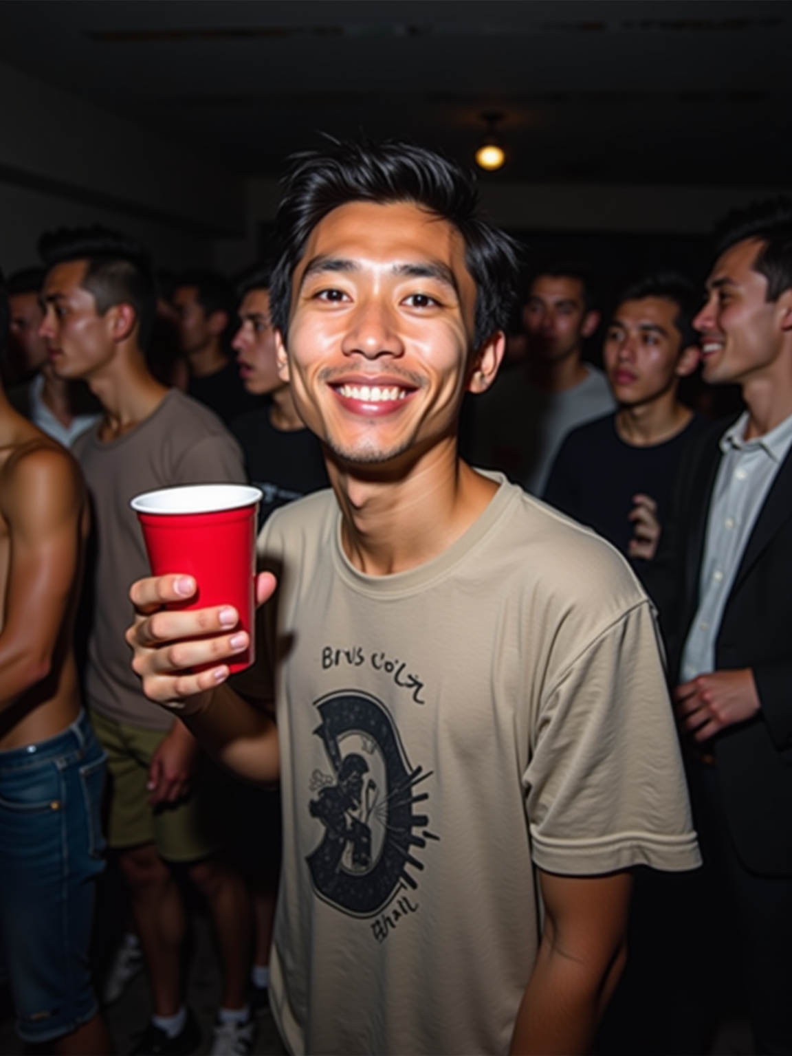 camera flash overexposed, model at a crowded house party, red solo cup in hand. Wearing a graphic tee, casual pose. Flash-lit faces, messy background, candid vibe.