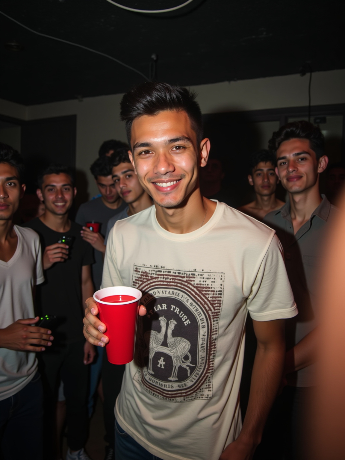 camera flash overexposed, model at a crowded house party, red solo cup in hand. Wearing a graphic tee, casual pose. Flash-lit faces, messy background, candid vibe.