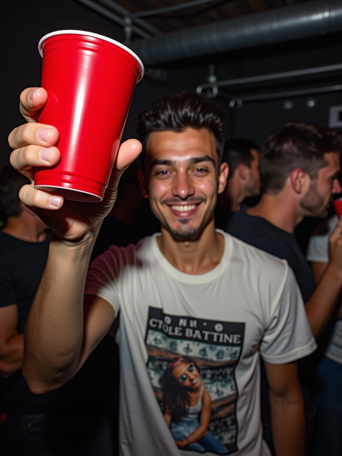 camera flash overexposed, model at a crowded house party, red solo cup in hand. Wearing a graphic tee, casual pose. Flash-lit faces, messy background, candid vibe.
