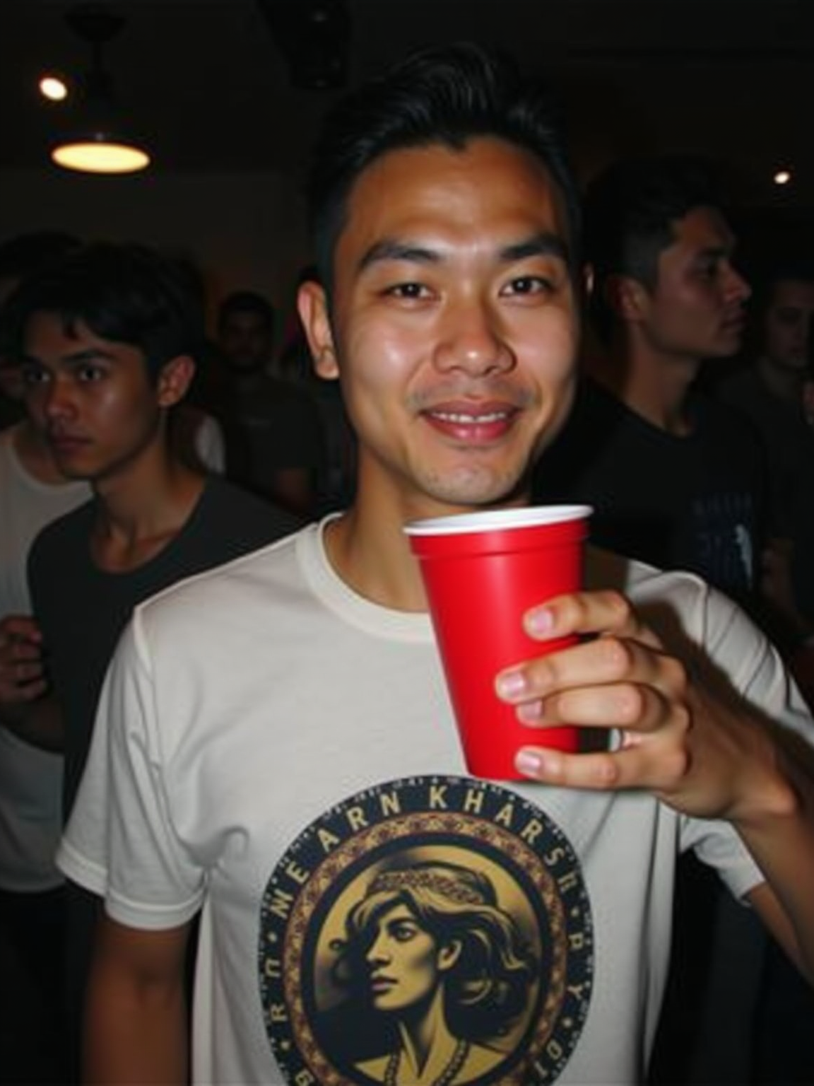 camera flash overexposed, model at a crowded house party, red solo cup in hand. Wearing a graphic tee, casual pose. Flash-lit faces, messy background, candid vibe.