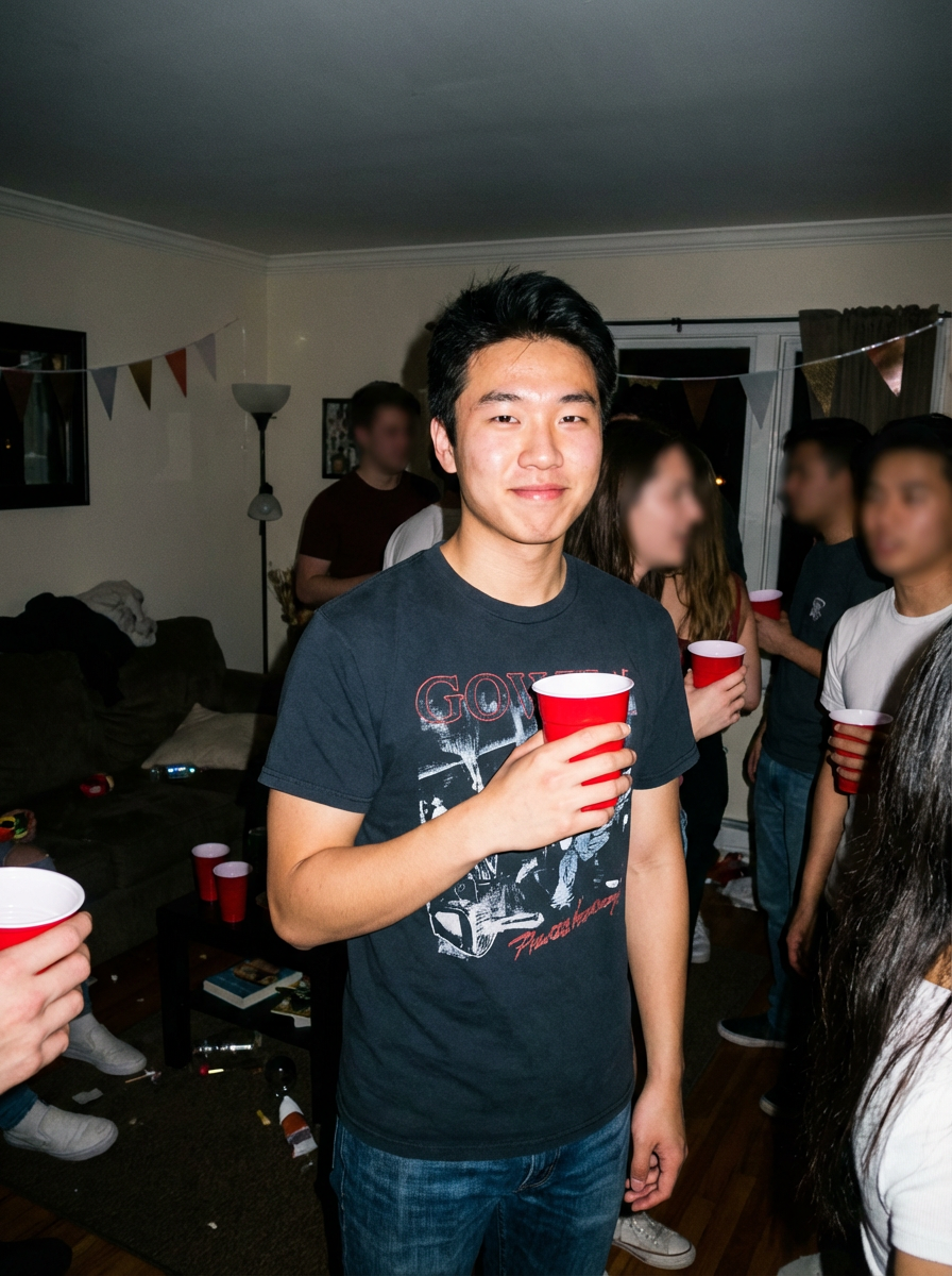 camera flash overexposed, model at a crowded house party, red solo cup in hand. Wearing a graphic tee, casual pose. Flash-lit faces, messy background, candid vibe.