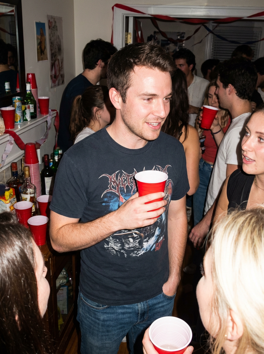camera flash overexposed, model at a crowded house party, red solo cup in hand. Wearing a graphic tee, casual pose. Flash-lit faces, messy background, candid vibe.