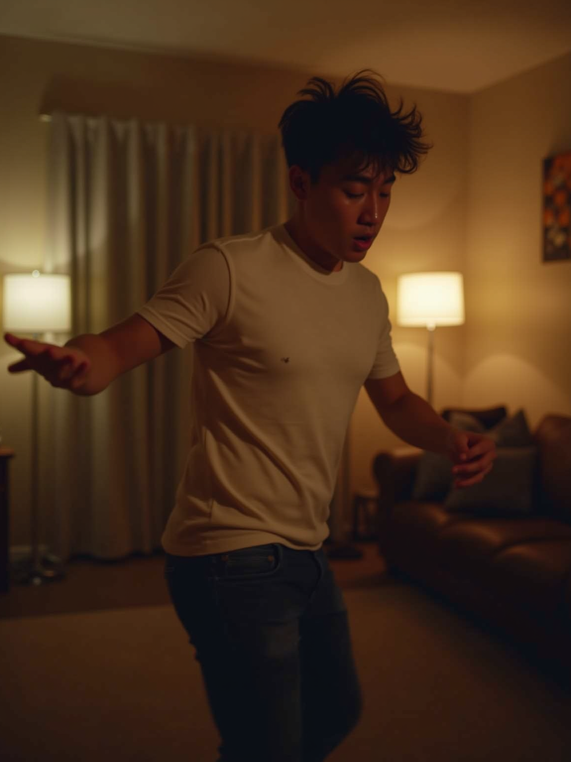 camera flash overexposed, model dancing in a dimly lit living room. Wearing vintage band tee, mid-dance move. Flash freeze, motion blur, party chaos.