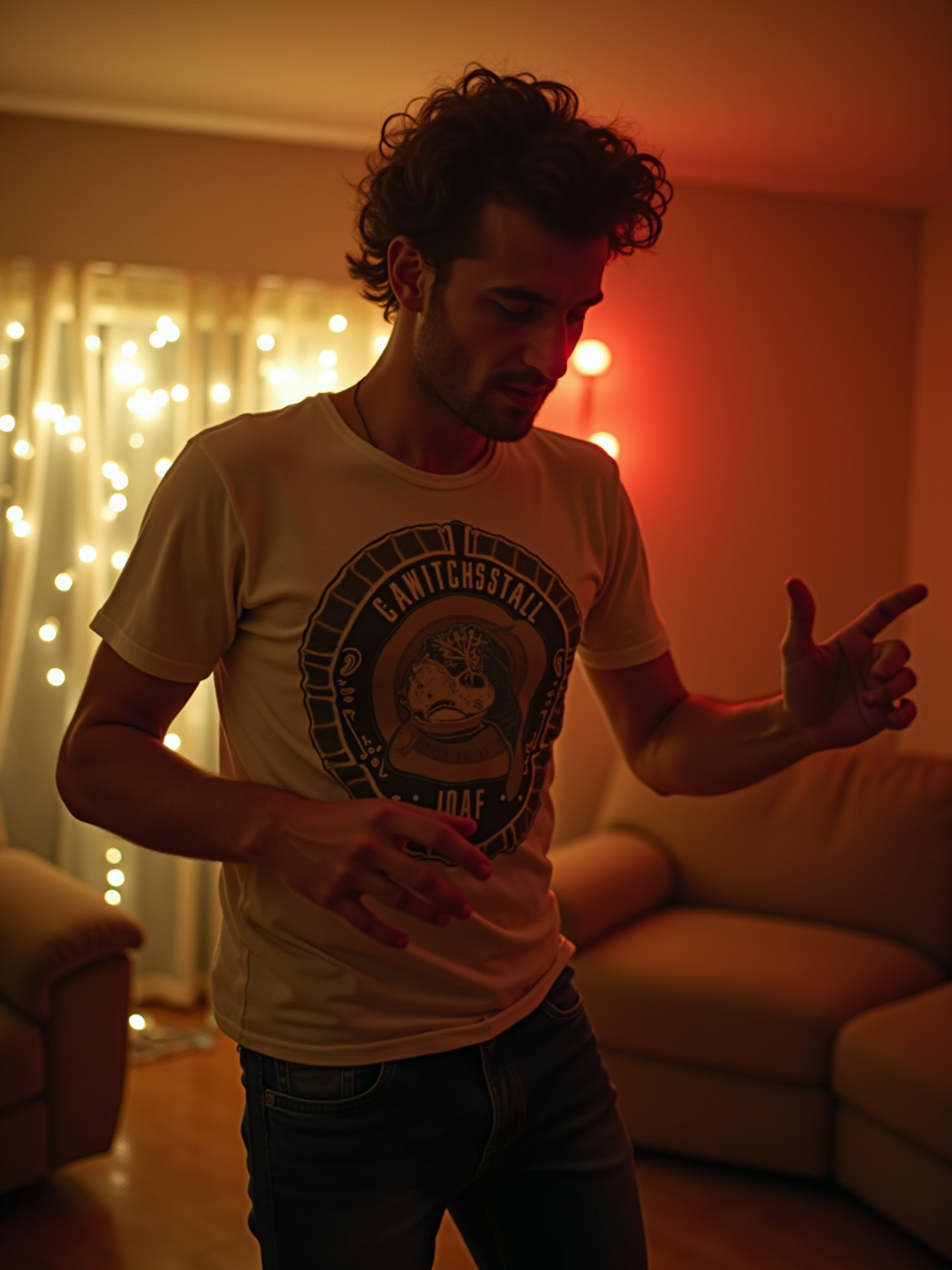 camera flash overexposed, model dancing in a dimly lit living room. Wearing vintage band tee, mid-dance move. Flash freeze, motion blur, party chaos.