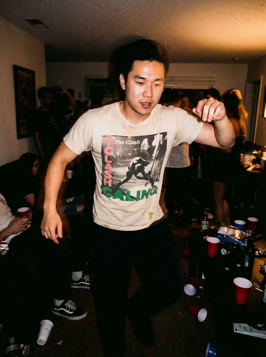 camera flash overexposed, model dancing in a dimly lit living room. Wearing vintage band tee, mid-dance move. Flash freeze, motion blur, party chaos.