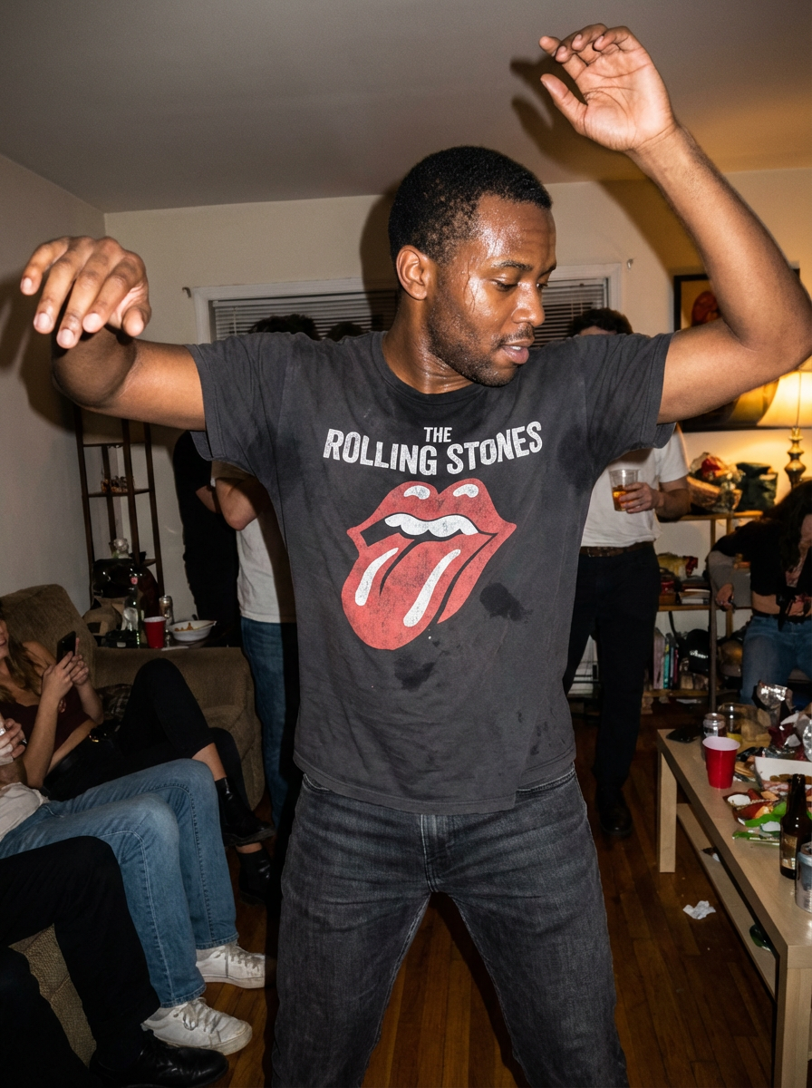 camera flash overexposed, model dancing in a dimly lit living room. Wearing vintage band tee, mid-dance move. Flash freeze, motion blur, party chaos.