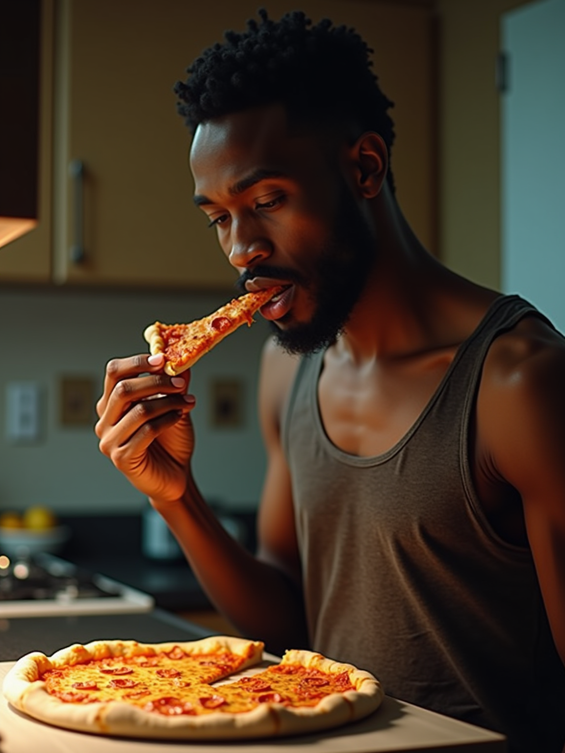 camera flash overexposed, model eating pizza on a kitchen counter at 2am. Wearing tank top, sleepy eyes, mid-bite. Flash-lit, cluttered kitchen, late night snack.