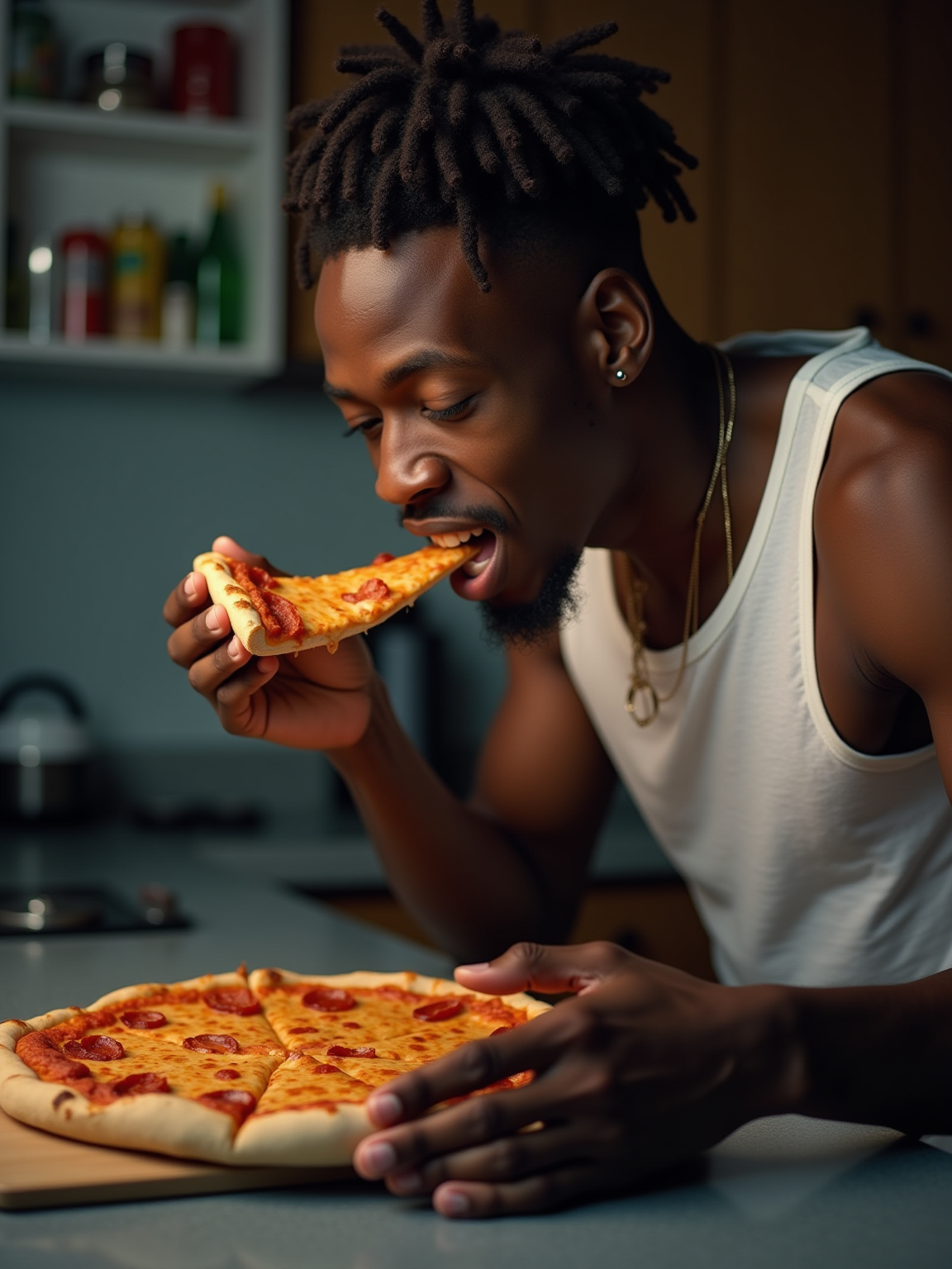 camera flash overexposed, model eating pizza on a kitchen counter at 2am. Wearing tank top, sleepy eyes, mid-bite. Flash-lit, cluttered kitchen, late night snack.