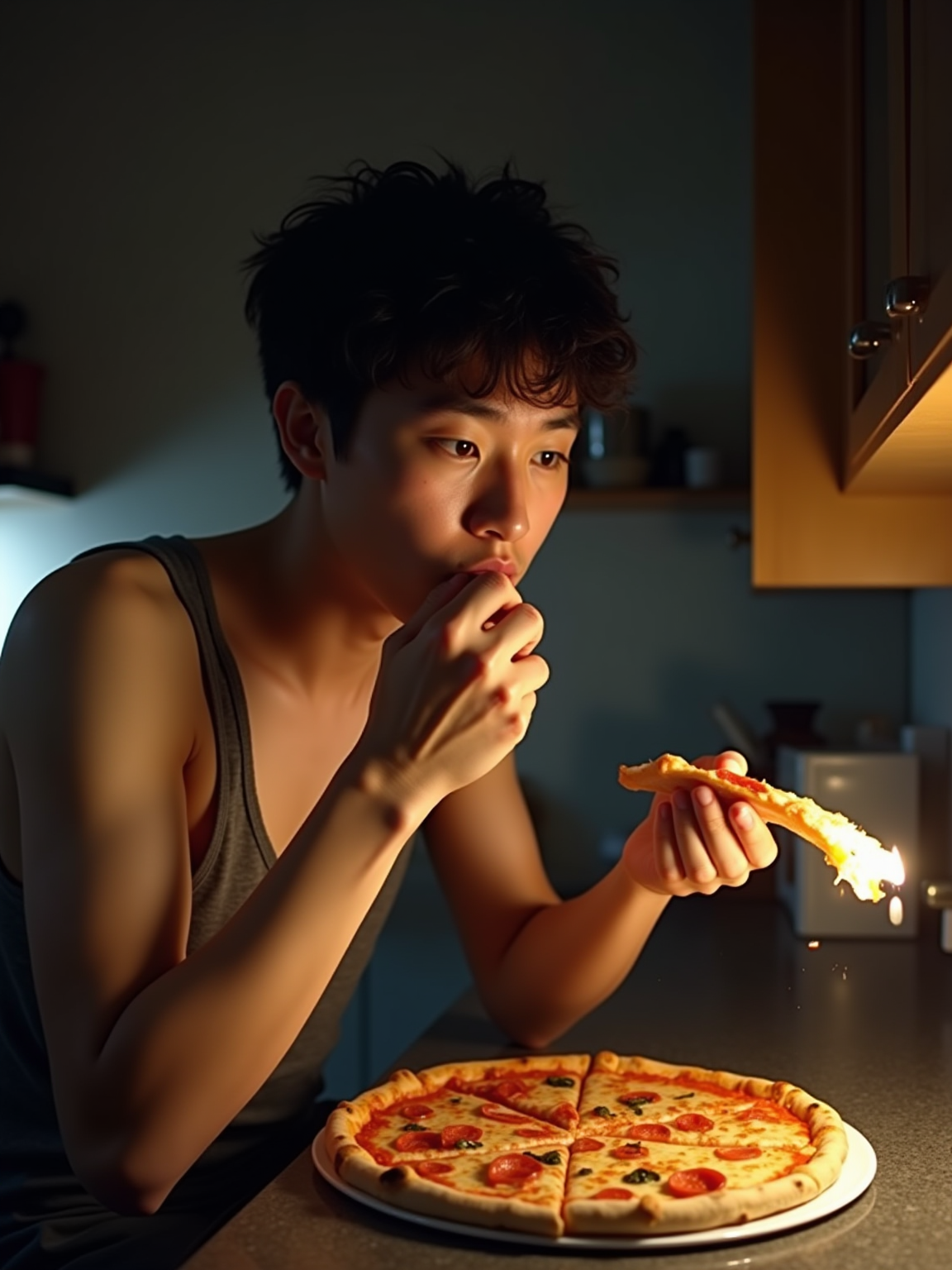 camera flash overexposed, model eating pizza on a kitchen counter at 2am. Wearing tank top, sleepy eyes, mid-bite. Flash-lit, cluttered kitchen, late night snack.