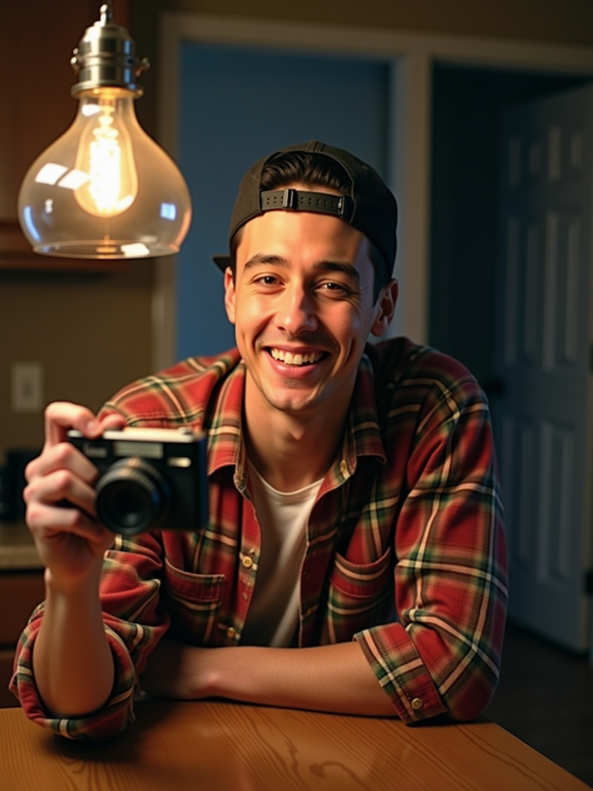 camera flash overexposed, model holding a disposable camera, mid-laugh at a kitchen table. Wearing flannel, backwards cap. Flash-lit, candid, party aftermath.