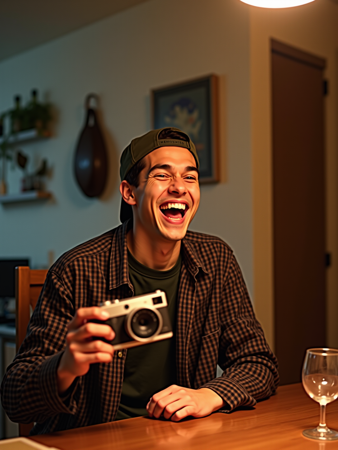 camera flash overexposed, model holding a disposable camera, mid-laugh at a kitchen table. Wearing flannel, backwards cap. Flash-lit, candid, party aftermath.
