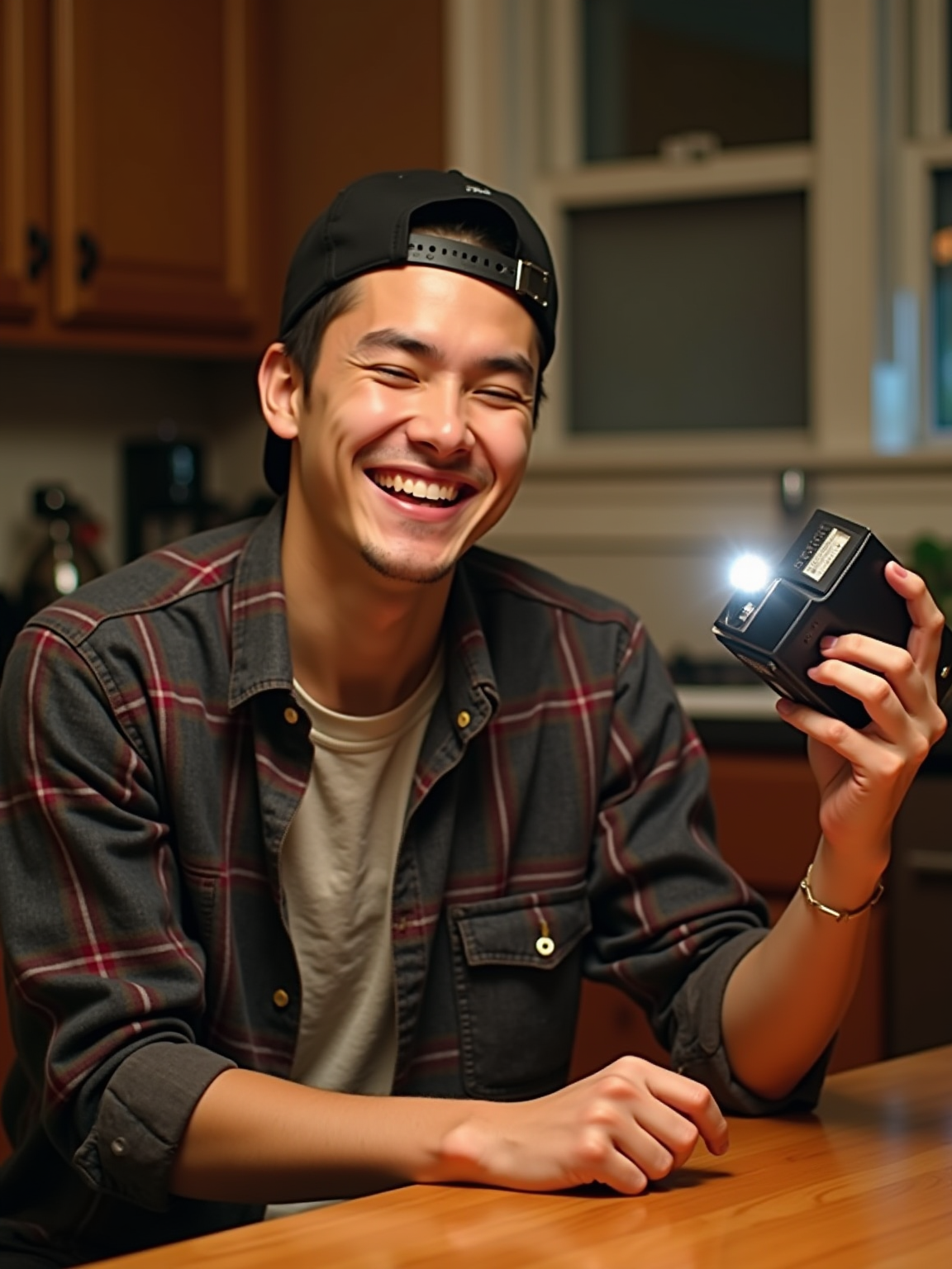 camera flash overexposed, model holding a disposable camera, mid-laugh at a kitchen table. Wearing flannel, backwards cap. Flash-lit, candid, party aftermath.