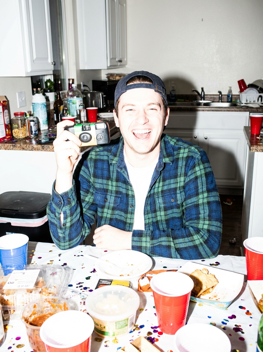 camera flash overexposed, model holding a disposable camera, mid-laugh at a kitchen table. Wearing flannel, backwards cap. Flash-lit, candid, party aftermath.