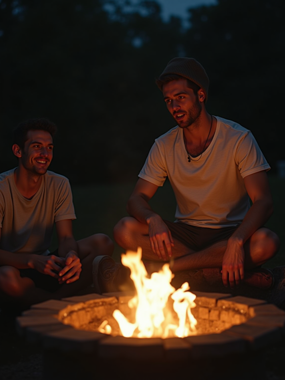 camera flash overexposed, model in a backyard, friends gathered around a fire pit. Wearing beanie, telling a joke. Flash, night, house party outdoors.