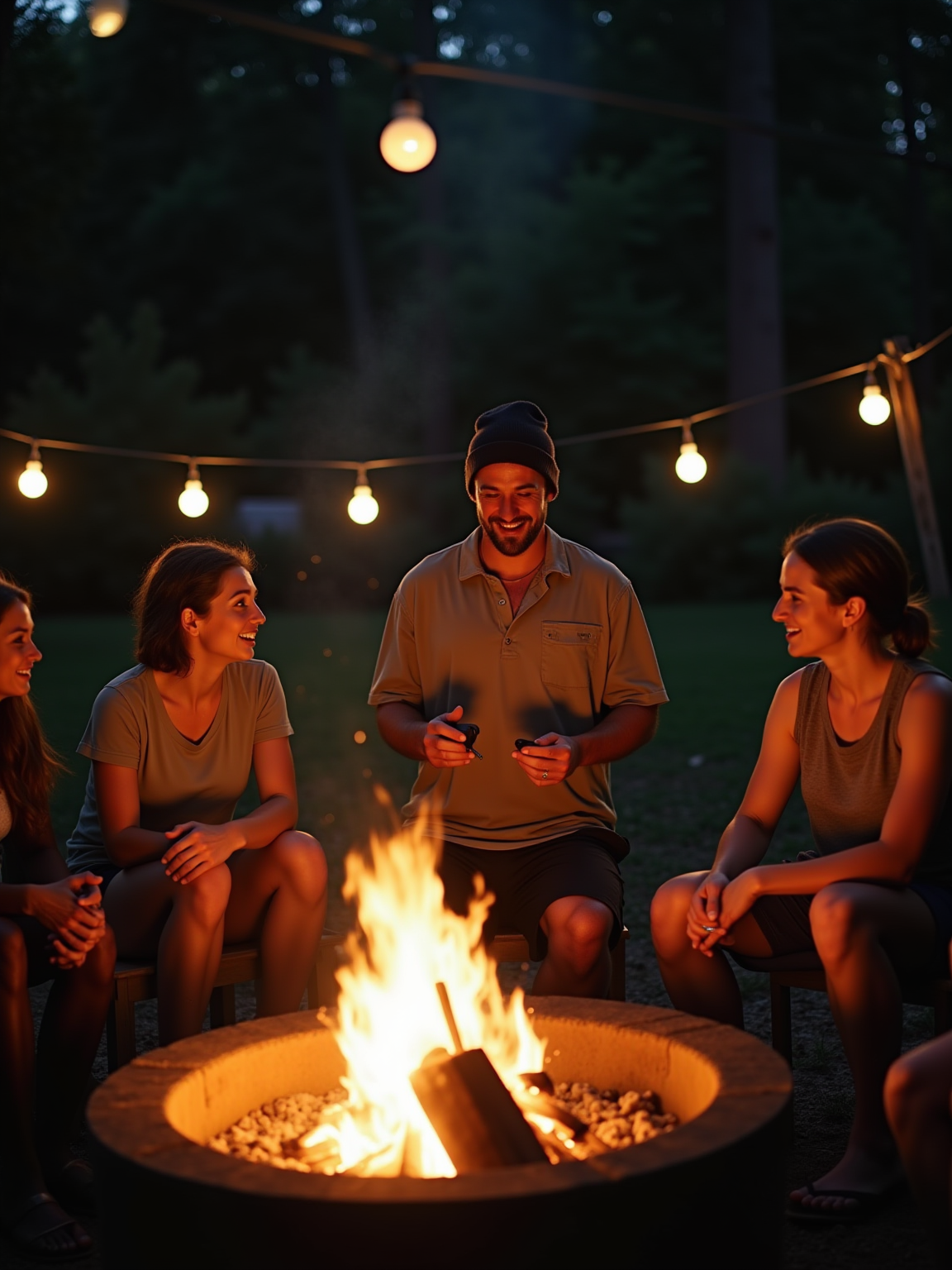 camera flash overexposed, model in a backyard, friends gathered around a fire pit. Wearing beanie, telling a joke. Flash, night, house party outdoors.