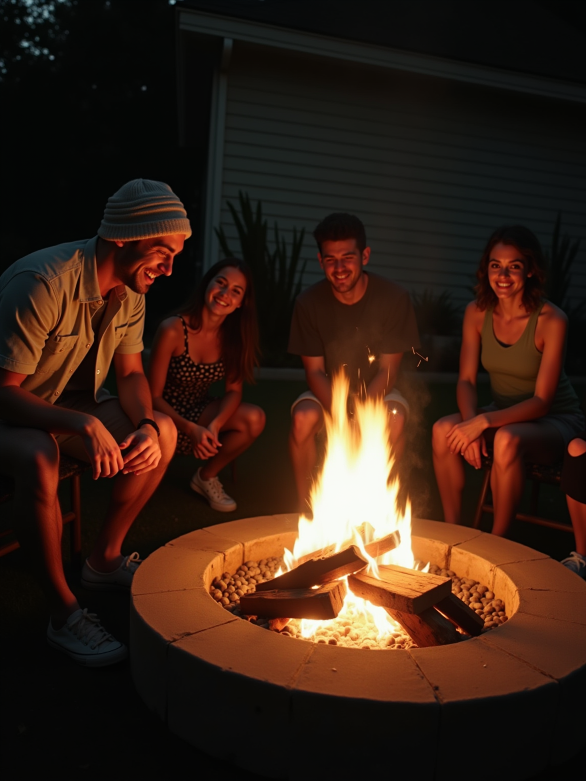 camera flash overexposed, model in a backyard, friends gathered around a fire pit. Wearing beanie, telling a joke. Flash, night, house party outdoors.