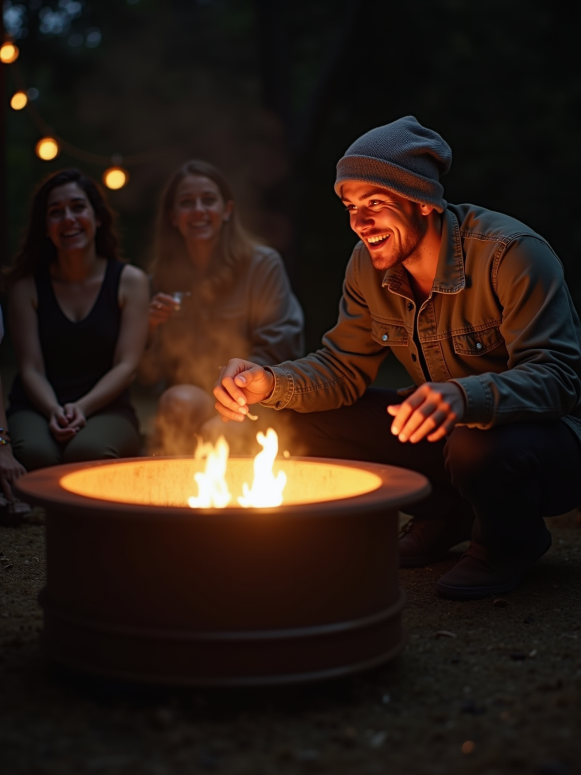camera flash overexposed, model in a backyard, friends gathered around a fire pit. Wearing beanie, telling a joke. Flash, night, house party outdoors.