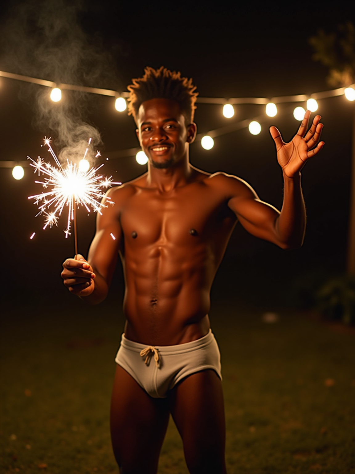 camera flash overexposed, model in a backyard with string lights, holding a sparkler. Wearing shorts, waving sparkler. Flash and string lights, summer night.