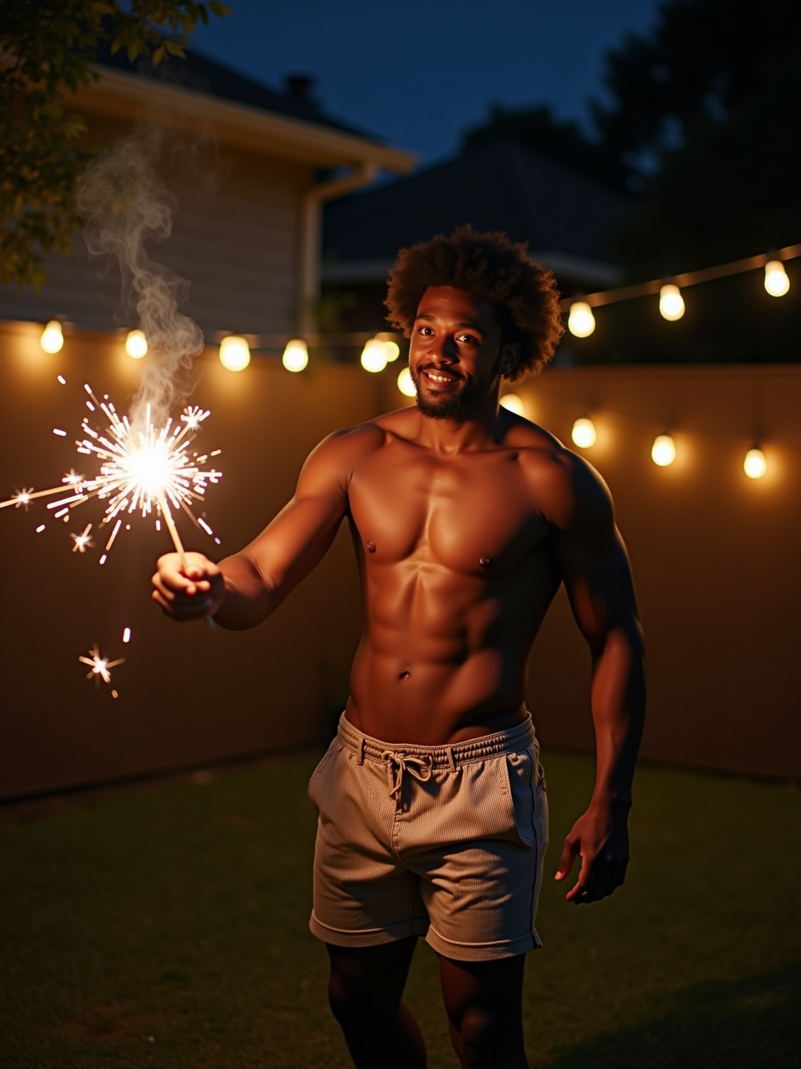 camera flash overexposed, model in a backyard with string lights, holding a sparkler. Wearing shorts, waving sparkler. Flash and string lights, summer night.