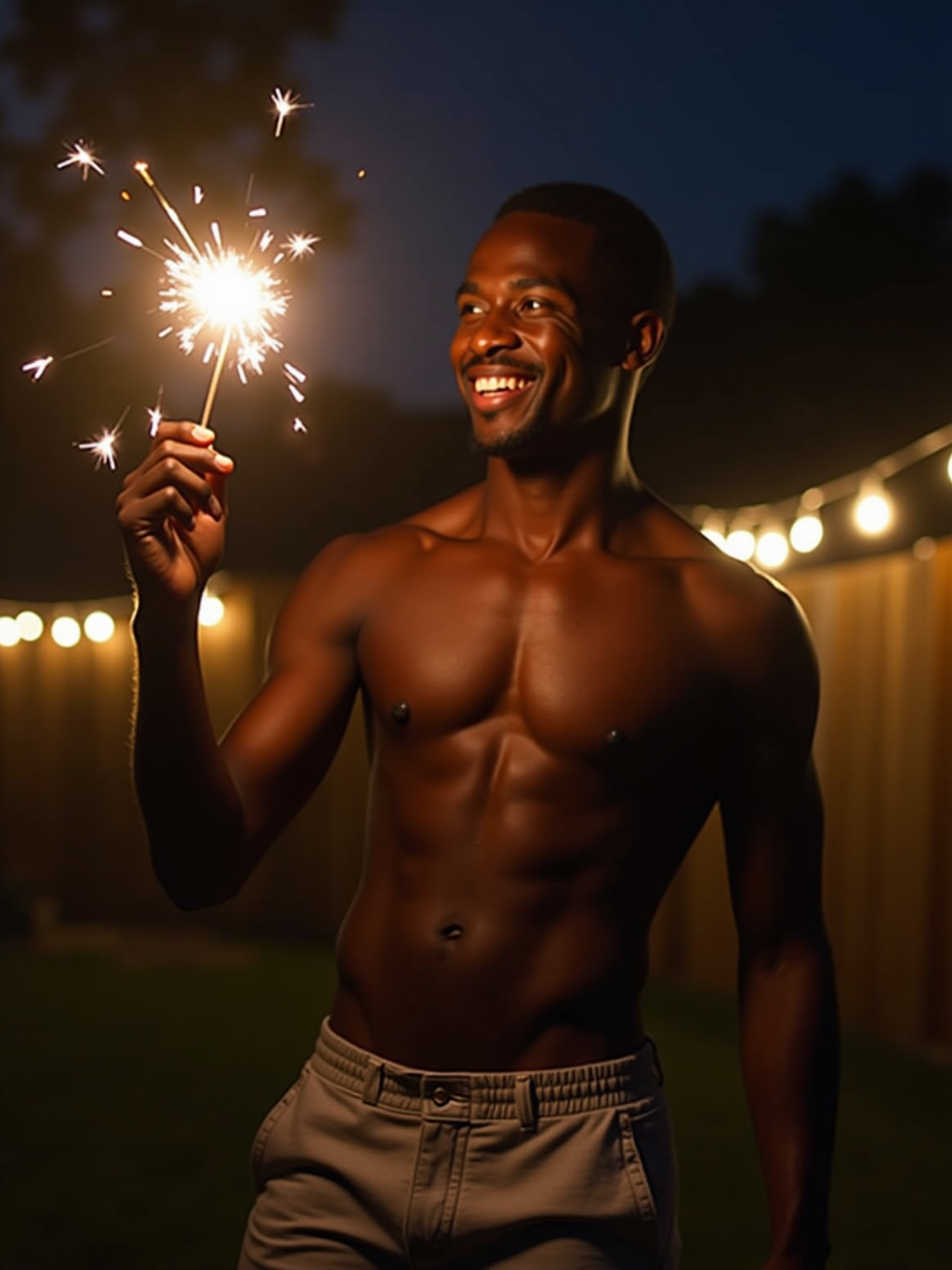 camera flash overexposed, model in a backyard with string lights, holding a sparkler. Wearing shorts, waving sparkler. Flash and string lights, summer night.