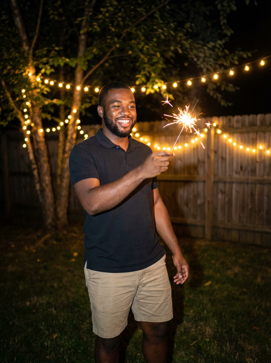 camera flash overexposed, model in a backyard with string lights, holding a sparkler. Wearing shorts, waving sparkler. Flash and string lights, summer night.
