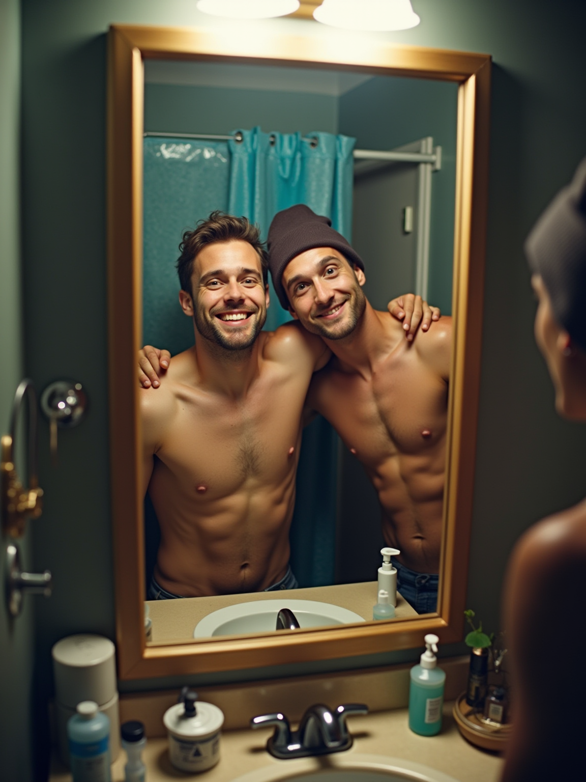 camera flash overexposed, model in a cramped bathroom mirror selfie with friends. Wearing beanie, goofy grin, arm around friend. Flash reflection, cluttered counter, chaotic fun.