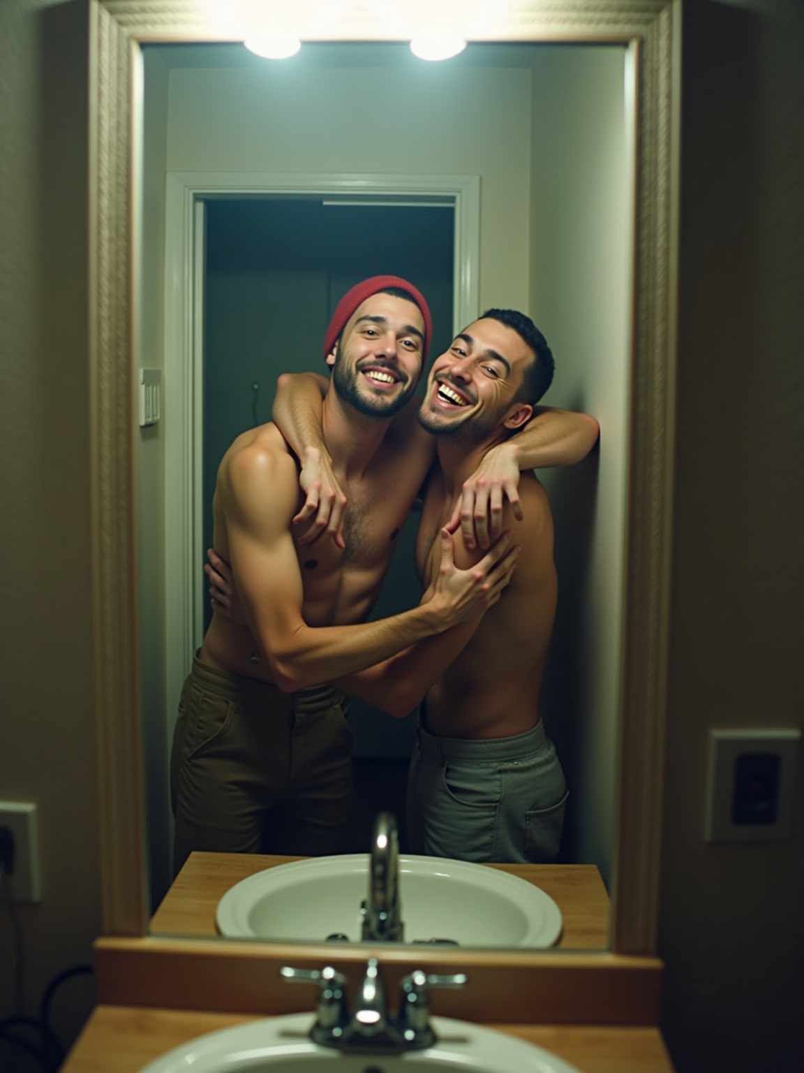 camera flash overexposed, model in a cramped bathroom mirror selfie with friends. Wearing beanie, goofy grin, arm around friend. Flash reflection, cluttered counter, chaotic fun.
