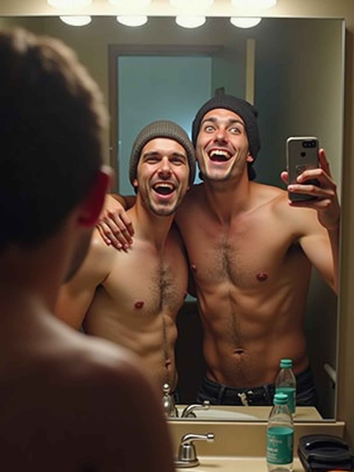camera flash overexposed, model in a cramped bathroom mirror selfie with friends. Wearing beanie, goofy grin, arm around friend. Flash reflection, cluttered counter, chaotic fun.