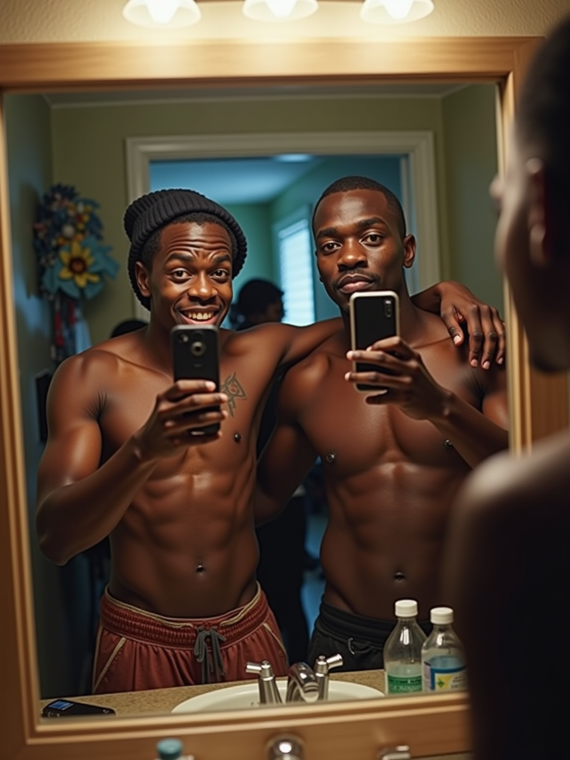 camera flash overexposed, model in a cramped bathroom mirror selfie with friends. Wearing beanie, goofy grin, arm around friend. Flash reflection, cluttered counter, chaotic fun.
