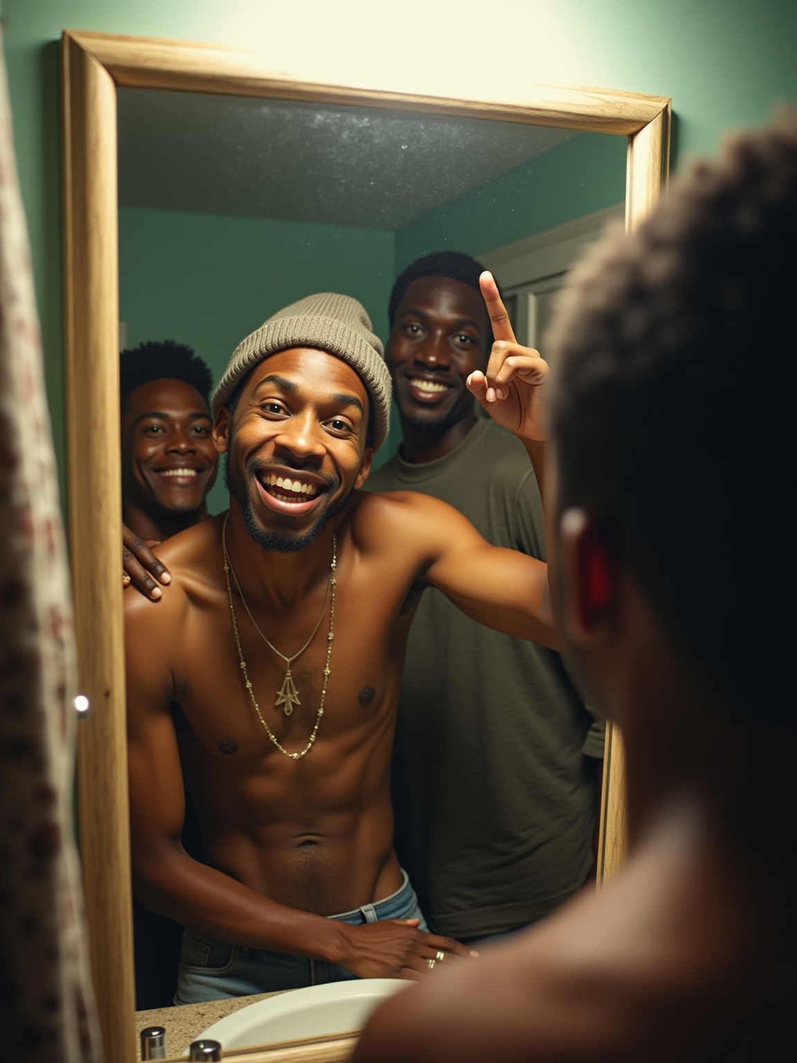 camera flash overexposed, model in a cramped bathroom mirror selfie with friends. Wearing beanie, goofy grin, arm around friend. Flash reflection, cluttered counter, chaotic fun.