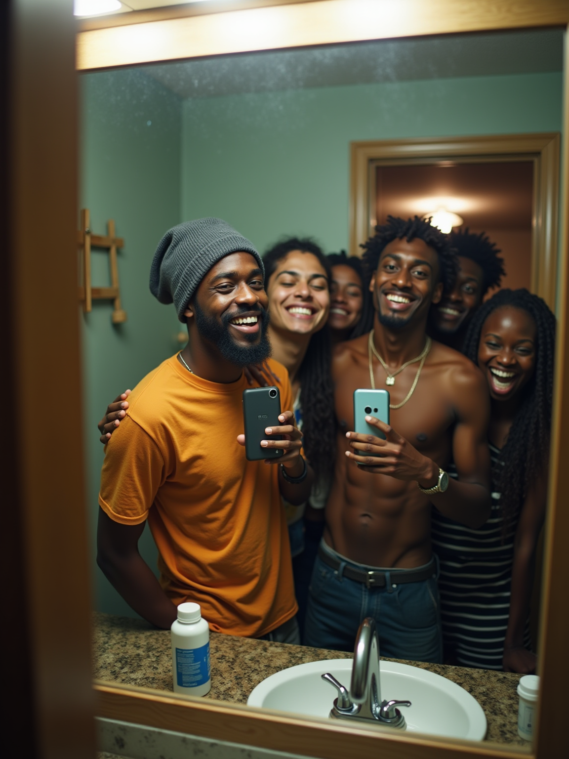 camera flash overexposed, model in a cramped bathroom mirror selfie with friends. Wearing beanie, goofy grin, arm around friend. Flash reflection, cluttered counter, chaotic fun.