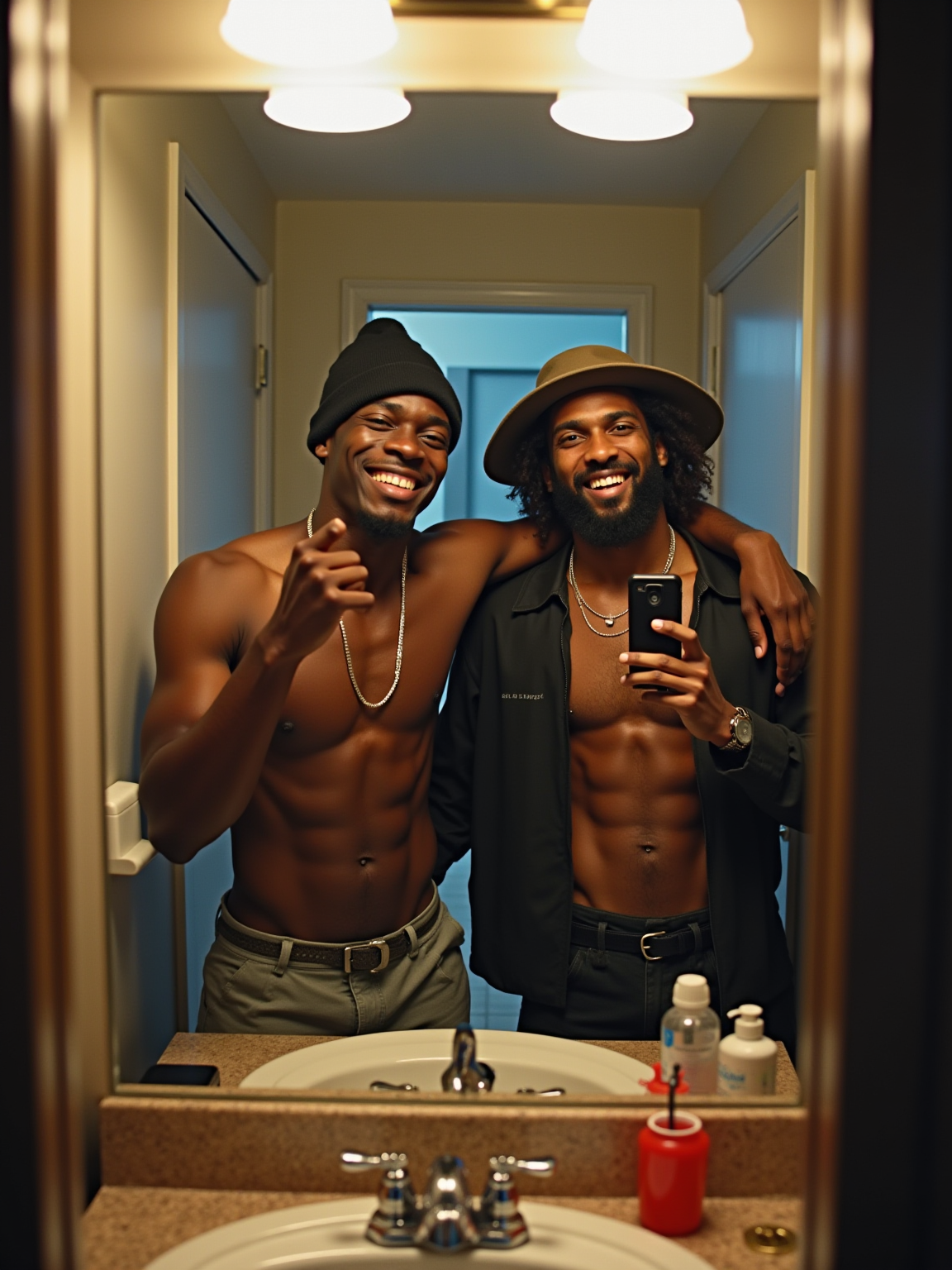camera flash overexposed, model in a cramped bathroom mirror selfie with friends. Wearing beanie, goofy grin, arm around friend. Flash reflection, cluttered counter, chaotic fun.